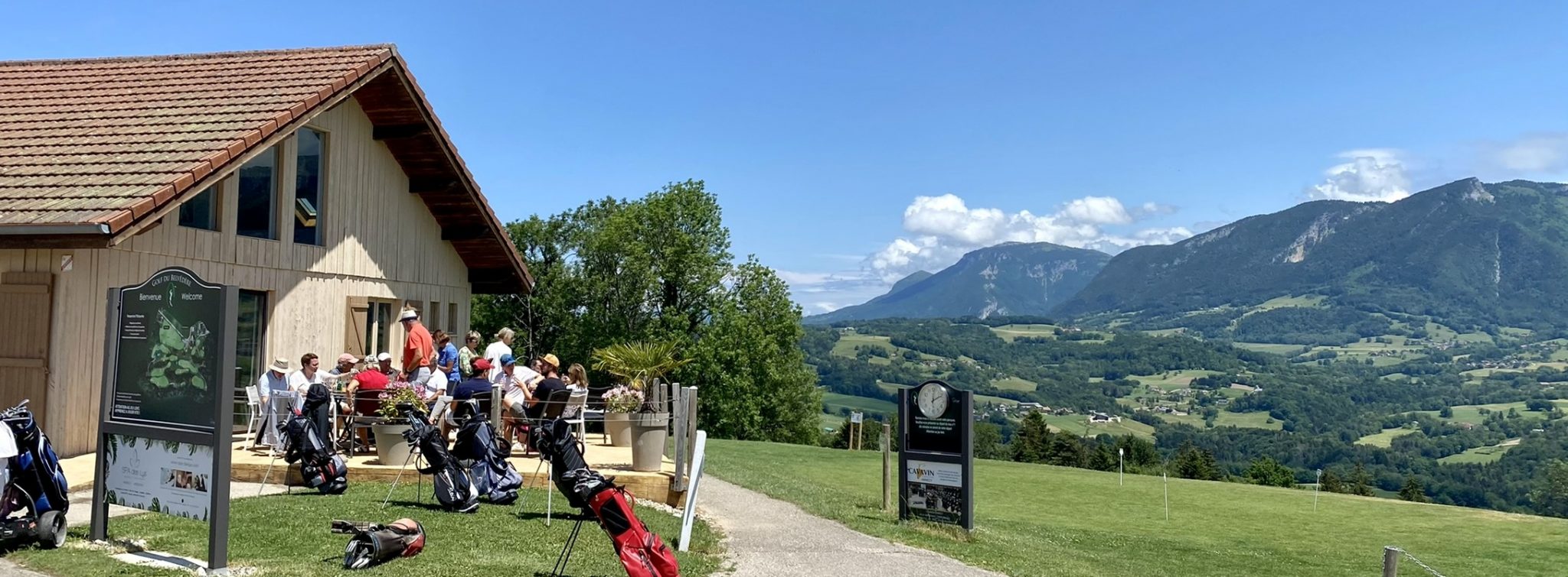 Vous pourrez vous délecter les papilles avec les différentes propositions gustatives mais également avoir une vue imprenable sur les fins de parties fort disputées au green du trou n°9 ainsi que sur le massif des Aravis.